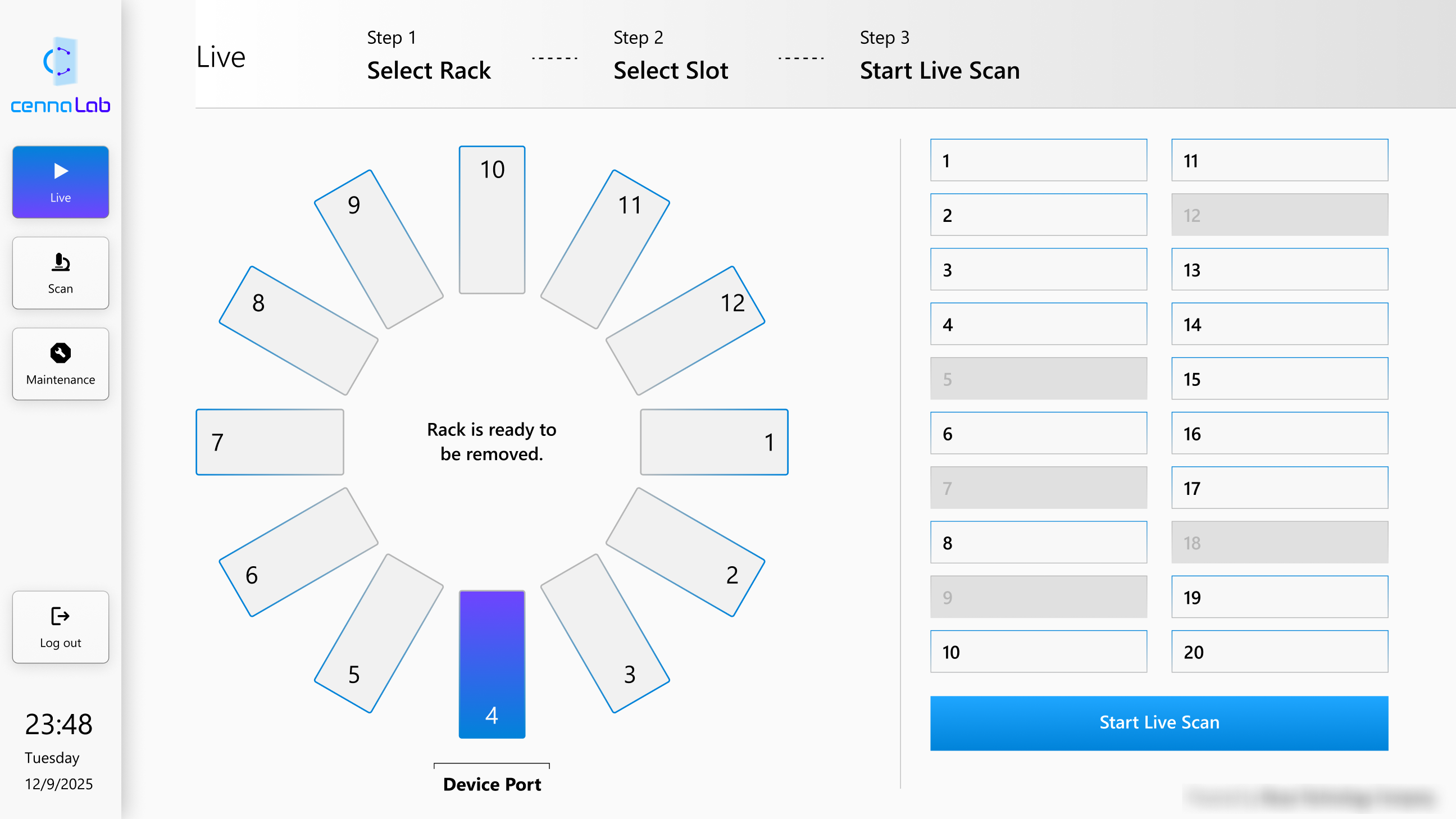CennaLab is a pathology device designed to scan blood samples and, with the assistance of AI, identify potential abnormalities. The device operates through a 15.6-inch touchscreen interface within a clinical environment.